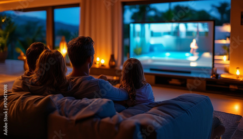A warm, cozy evening scene with a family of three sitting on a couch in a modern living room