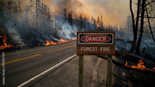 A warning sign stands near a road, indicating danger from an active forest fire nearby.