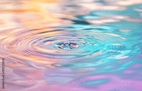 A water droplet hits the surface, causing ripples while vibrant colors reflect around it during dusk
