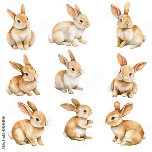 A watercolor set of playful baby bunnies, each depicted in various joyful poses. The hand-painted rabbits are illustrated with vibrant colors, isolated on a clean white background, making a delightful