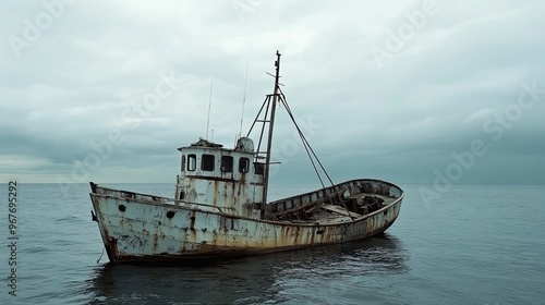 A weathered, abandoned fishing boat floats in calm waters under a cloudy sky.