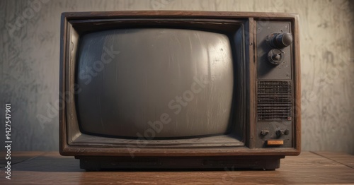 A weathered antique CRT television set, showing signs of age and wear Dust and scratches visible , damaged, worn, appliance