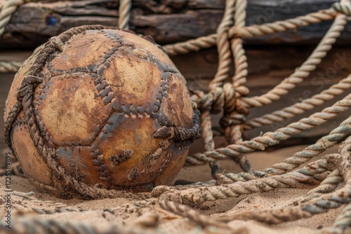 A weathered ball lies tangled in ropes on a sandy surface, evoking a sense of adventure and the passage of time.