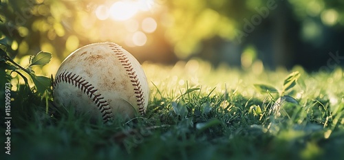 A weathered baseball resting on grass, illuminated by soft sunlight.