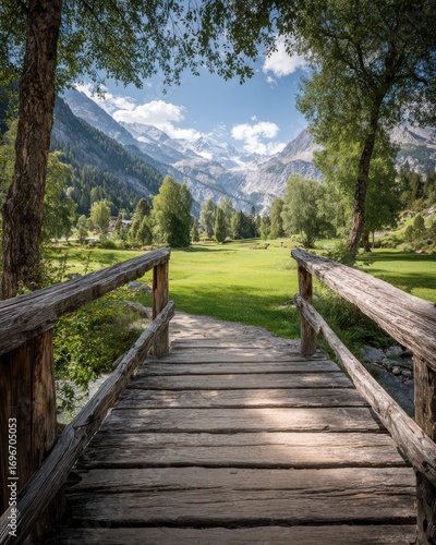 A weathered wooden bridge stretches across a lush green valley, framed by towering mountains and sunny skies, inviting a sense of tranquility.