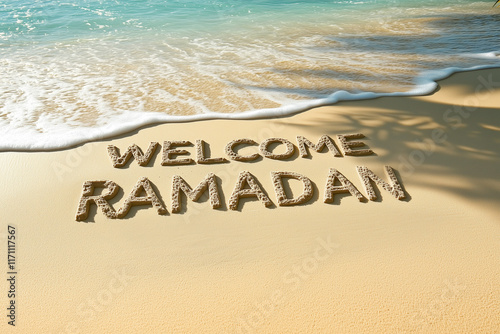 A "WELCOME RAMADAN" message written in sand on a beach, with waves gently touching the text with copy space. Warm golden light.