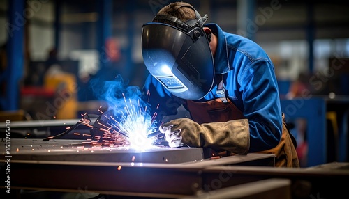 A welder, wearing protective gear, skillfully welds metal in a factory setting