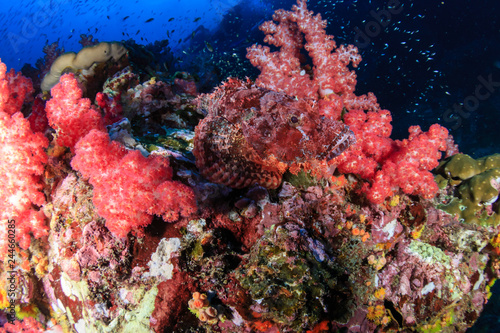 A well hidden Bearded Scorpionfish (Scorpaenopsis barbata) hidden amongst soft corals on a tropical reef (Richelieu Rock, Thailand)