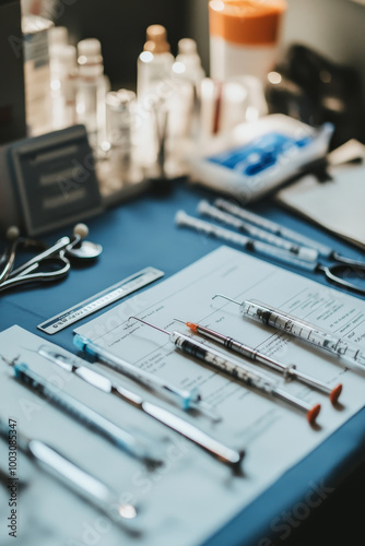 A well organized medical workspace featuring syringes, stethoscopes, and various medical supplies. scene conveys sense of professionalism and readiness for patient care
