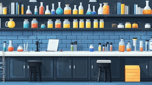 A well-equipped chemistry lab with various glassware, reagents, and equipment on shelves and counter.