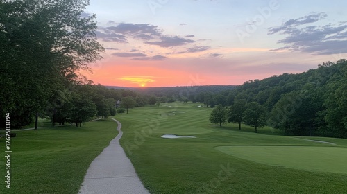 A well-maintained golf course with rolling fairways and a stunning sunset in the background.
