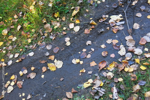 A wheel print on an autumn dirt road.