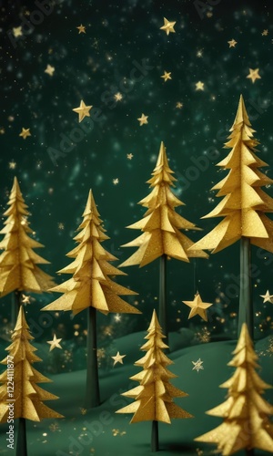 A whimsical arrangement of paper trees and stars on a dark green background adorned with shimmering space gold accents, ornamentation , trees