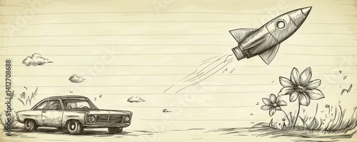 A whimsical black and white drawing of a rocket, car, and flowers is depicted on notebook paper