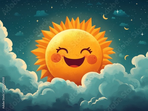 A Whimsical Cartoon Sun with Cheerful Expression Amongst Fluffy Clouds and Starry Night Sky, Displaying a Playful and Imaginative Children's Theme