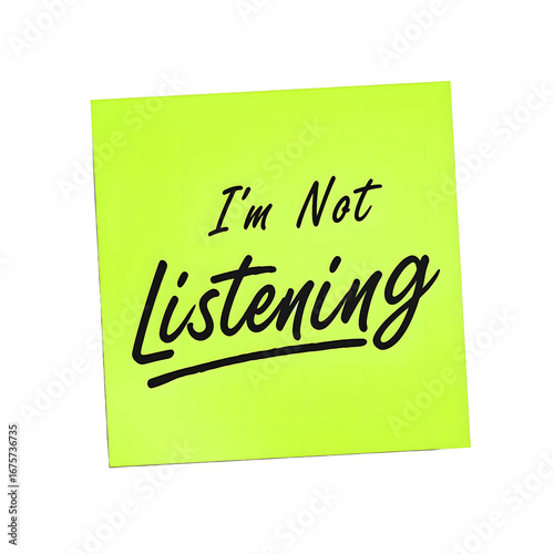 A whimsical green sticky note with Im Not Listening in friendly cursive centered on a white background, isolated