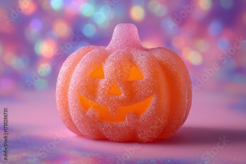 A whimsical Halloween scene featuring a smiling jack-o'-lantern pumpkin, softly glowing against a backdrop of blurred, colorful lights on a pink surface.
