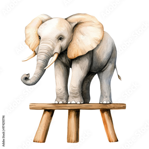 A whimsical illustration of an elephant balancing on a wooden plank, showcasing grace and playfulness in a vibrant setting.
