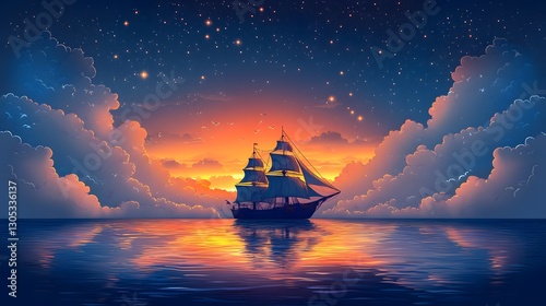 A Whimsical Pirate Ship Journeying Through a Serene and Starry Night Over a Peaceful Sea
