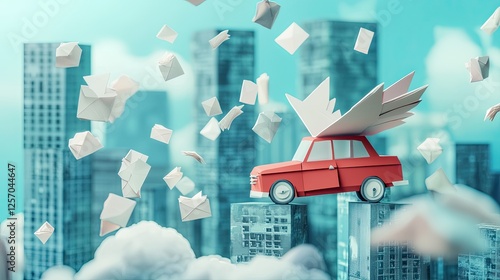 A whimsical red car with wings flies through a cityscape, surrounded by floating envelopes