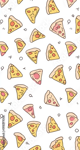 A whimsical, repeating pattern of sliced pizzas on a clean white background