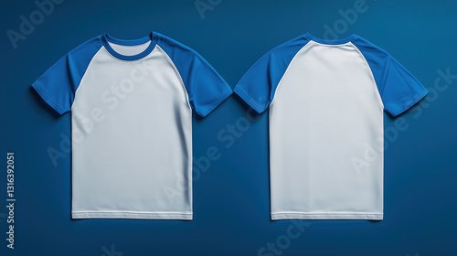 A white and blue short-sleeve raglan t-shirt is displayed from the front and back and a flat lay concept is used as a mockup design template
