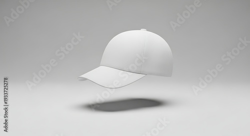 A white baseball cap mockup displayed on a gray background with a shadow underneath it, captured from a slightly elevated viewpoint.
