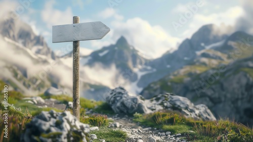 A white blank mock up sign post in the shape of an arrow with a beautiful landscape of mountains in the background, misty hills, backdrop,