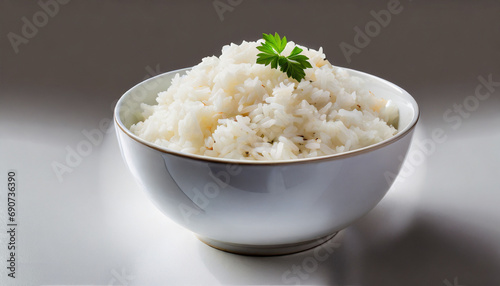A white bowl of cooked rice on white background