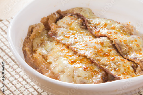 A white ceramic dish filled with rice and beef slices covered in melted golden cheese.