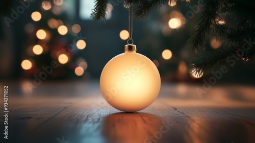 A white Christmas ornament hangs from a tree branch
