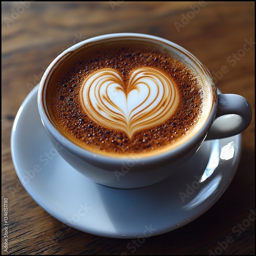 A white coffee cup with a heart design on it