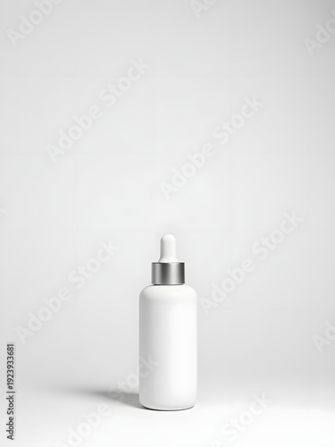 A white cosmetic bottle with a dropper lid is centered on a plain white surface, viewed from the front.