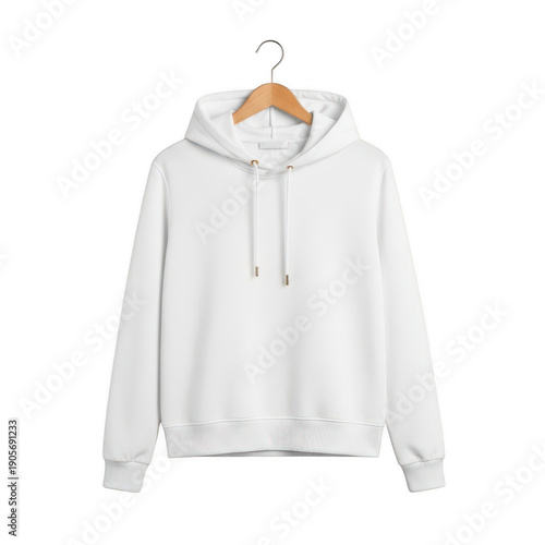 A white cropped hoodie with drawstrings hanging on a wooden hanger against a plain white background. isolated on transparent background
