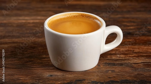 A white cup filled with coffee, resting on a wooden table, showcasing a rich golden-brown beverage perfect for warm mornings.