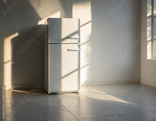 A white fridge positioned on a tiled floor adjacent to a white wall, featuring two doors with the upper one being smaller. Interior of a room illuminated by sunlight entering through a window.