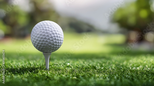 A white golf ball resting on a tee with a lush green course background, ready for the perfect swing.