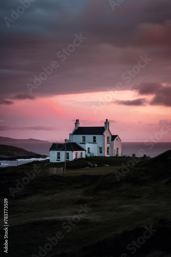 A white house against a dramatic sunset, rugged terrain, ocean view, serene, ethereal glow, solitude, and tranquility