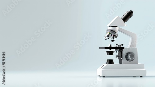A white microscope stands on a white surface with a plain background.