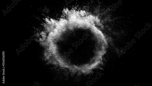 A white powder explosion forming a ring against a black background, with fine particles dispersed outwards