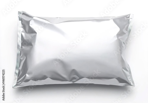 A white square-shaped aluminum foil packaging bag with slight wrinkles on a pure white background.