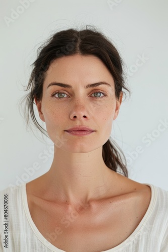 A white woman without makeup looking calm and serious, show her head and neck, isolated on a white background,