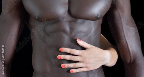 A white woman's hand on a muscular belly of a black man