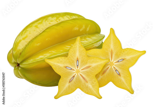 A whole starfruit and a cross-section slice, isolated on white background, no depth of field, sharp.