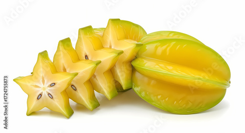 A whole yellow star fruit sits next to several sliced star fruits, revealing their star shape and seeds on a white background.
