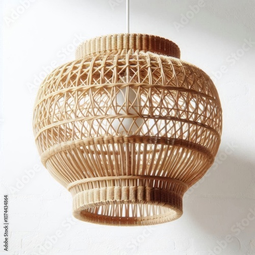 A wicker lamp shade hanging from a ceiling against a white background. AI generated.