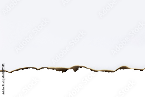 A wide burnt edge on white paper, featuring a gradient of scorched and charred texture. Ideal as a grunge frame or vintage background element. Isolated on white background with clipping path.