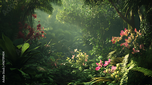 A wide shot of a secluded area in the Amazon rainforest, highlighting an array of rare flowering plants and ferns