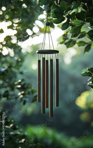 A wind chime hanging from a tree branch