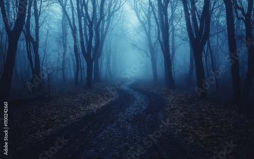 A winding, misty path through a dark, eerie forest with tall, bare trees enveloped in fog.